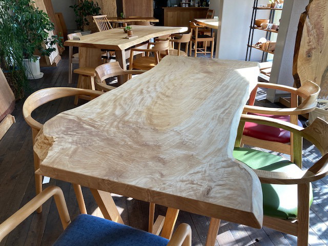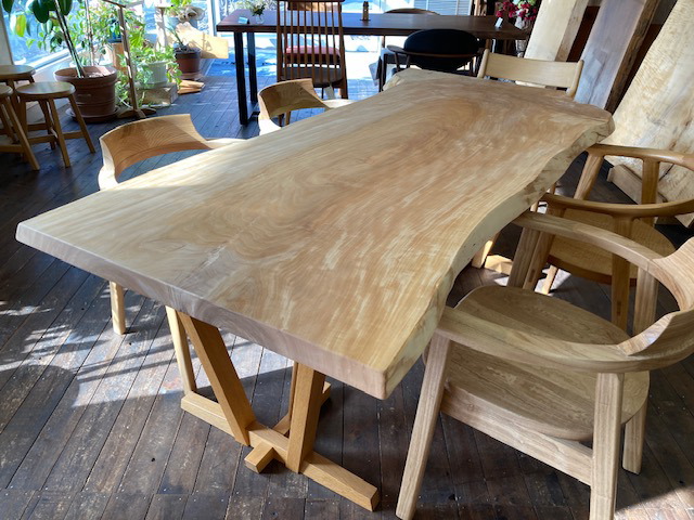 タタモ一枚板のダイニングテーブルタモ一枚板ル脚付きで¥297,000(税込み